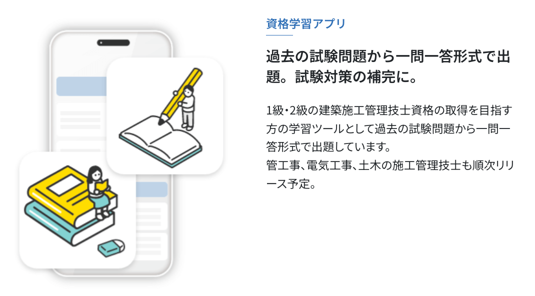 施工管理技士の試験対策コンテンツが充実しているため、資格取得と若手の早期戦力化の両立に役立ちます。