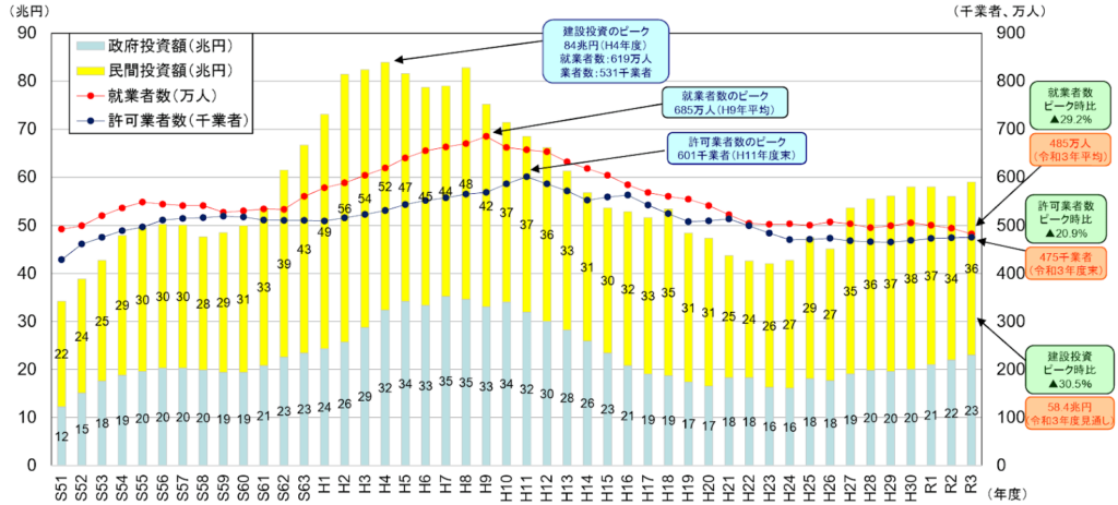 また、国土交通省が調査したデータを見ても、建設業界の就業者数が減少傾向にあるとわかります。